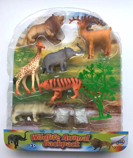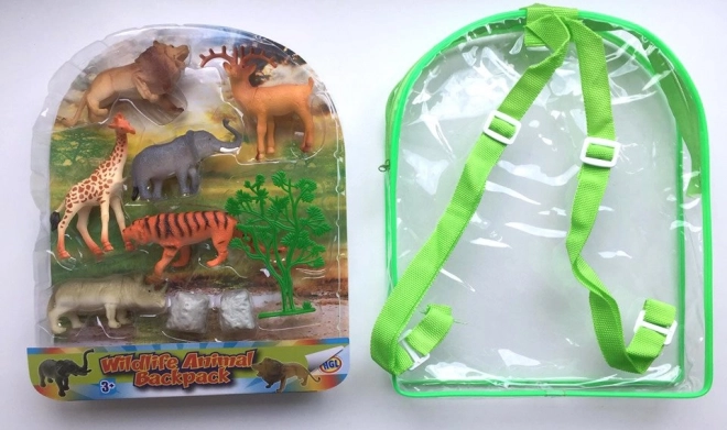 Leuke set met 6 wilde dierenfiguren in een praktische rugzak: leeuw, tijger, hert, neushoorn, olifant en giraffe met accessoires. De transparante rugzak met verstelbare schouderbanden maakt dragen en opbergen eenvoudig; de figuren zijn ca. 8 × 5 × 3 cm.