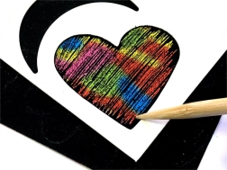 Onder de zwarte laag zitten levendige kleuren die na het krassen opvallende afbeeldingen en decoraties creëren.