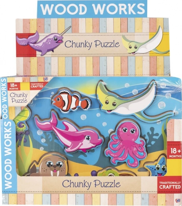 De houten inlegpuzzel met onderwatermotieven biedt een geweldige manier om kinderen kennis te laten maken met verschillende soorten zeedieren. Hij is ontworpen om het leggen te vergemakkelijken met behulp van een houten ondergrond, en de randen zorgen ervoor dat de afzonderlijke houten diertjes stevig op hun plek blijven.