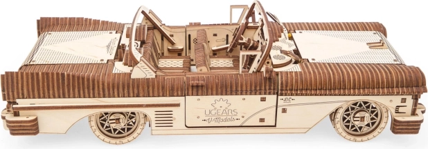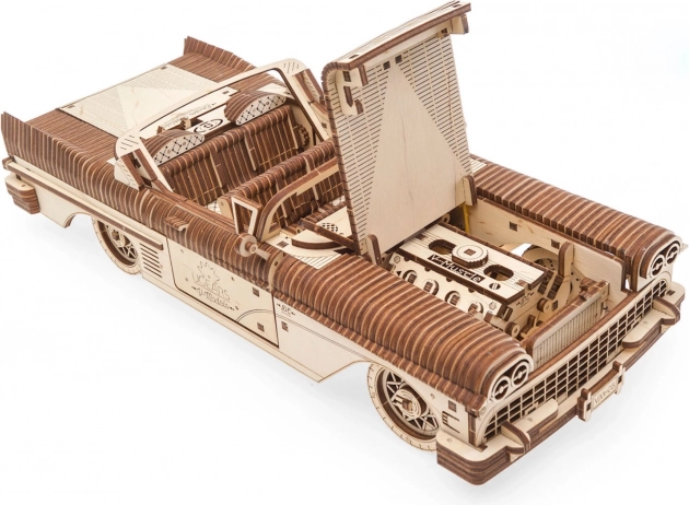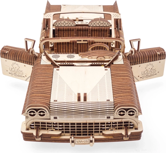 Het model verrast met tal van los meegeleverde details – achter de achterspatborden vind je een koffer met gereedschap en een krik, werkende ruitenwissers, uitschuifbare ruitjes in de deuren en een neerklapbare achterbank. De geveerde wielophanging zorgt voor een realistische rit. De bouwset is gemaakt van kwalitatief triplex en wordt geleverd met een uitgebreide handleiding.