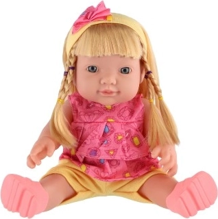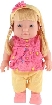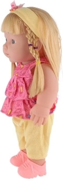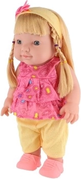 Deze realistische pop van 30 cm is een geweldige keuze om fantasie en sociale vaardigheden te ontwikkelen. Ze heeft een stevig plastic lichaam, lang doorkambaar haar en draagt vrolijke, kleurrijke outfits. De ingebouwde geluidsmodule wordt geactiveerd nadat je het borgpinnetje in het mechanisme op de rug hebt verwijderd.