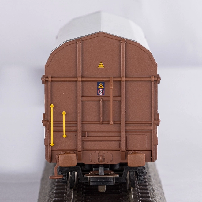 Deze set van twee wagons is zorgvuldig ontworpen met oog voor details, inclusief zorgvuldig vervaardigde onderstelonderdelen en kopwanden met zeilbevestigingsmechanisme. Hun kappen zijn afneembaar, wat een gecompliceerd interieur onthult met ligplaatsen voor lading - een staalrolmonster is bij de verpakking inbegrepen. De wagons zijn uitgerust met aantrekkelijke, contrasterende kleurdetails zoals handgrepen en haakjes, en hebben een hoogwaardige laklaag en scherpe bedrukking die zelfs de kleinste details vastlegt.