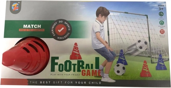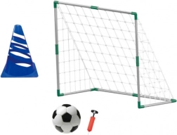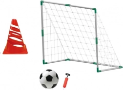 De set bevat een doel met net, voetbal, pompje en trainingskegel – kinderen kunnen meteen na het uitpakken beginnen met spelen.