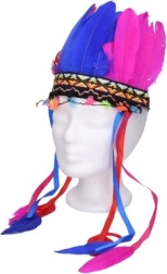 De hoofdband is versierd met gekleurde veren en decoratieve linten, waardoor het de perfecte aanvulling is voor kostuums.