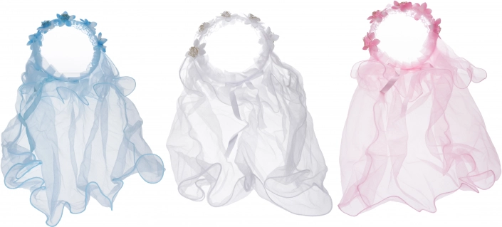 Kies uit verschillende kleuren (wit, roze, blauw) en stem de outfit af op je stemming. De sluier van ca. 55 cm valt subtiel over de rug en zorgt voor een elegant, vloeiend effect op foto’s en tijdens beweging.