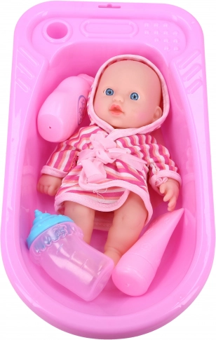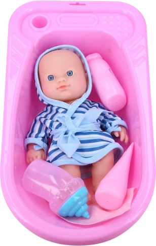 Badset met pop omvat badkuipje en handdoek voor realistisch spel. Ideaal voor kinderen die van het verzorgen van hun speelgoed houden.