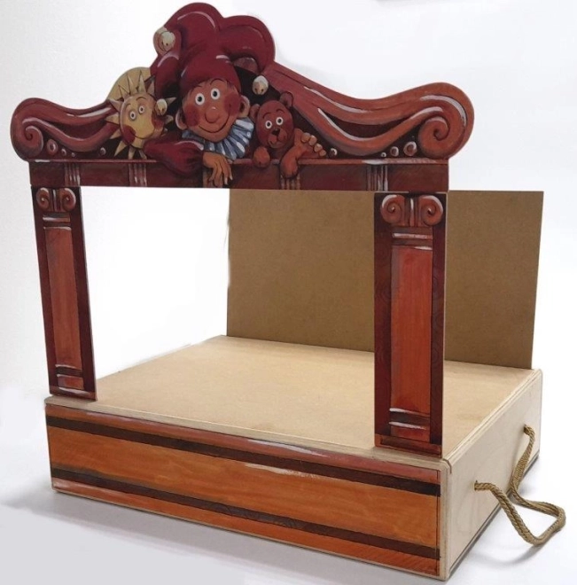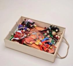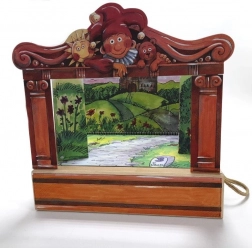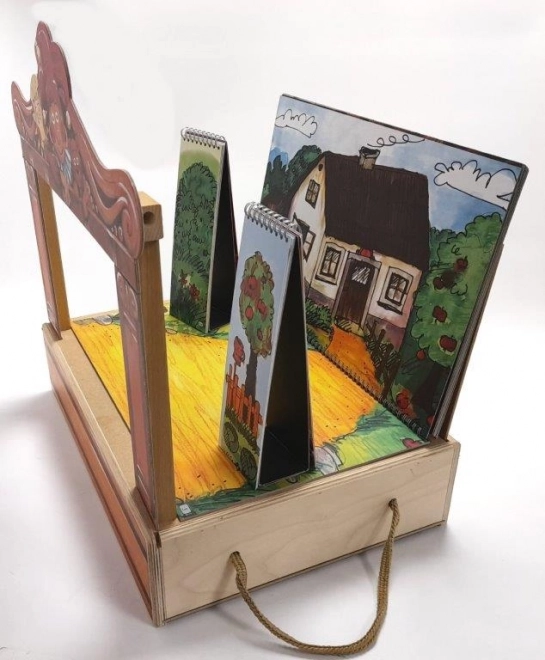 In de doos vind je 14 houten poppen, 11 kleurrijke scènes, een proscenium, een gordijn en zijkulissen – allemaal overzichtelijk opgeborgen in een houten kist met handvat.