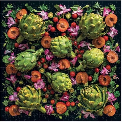 Geniet van een esthetische ervaring met een motief van de bekende fijnproever en fotografe Sarah Phillips, het brein achter het project Ugly Produce is Beautiful. Het contrast van de zwarte achtergrond met de levendige tinten van groene artisjokken, robijnrode tomaten en paarse bloemen creëert een indrukwekkend beeld dat zowel tijdens het leggen als ingelijst tot zijn recht komt.
