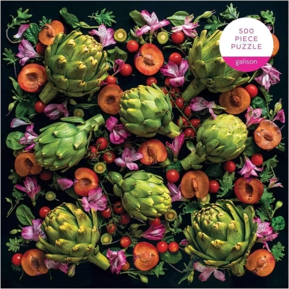 Ontdek de charme van perfecte imperfecties met de GALISON puzzel Artisjokbloemen 500 stukjes. Het motief van fotografe Sarah Phillips brengt een contrasterende compositie met artisjokken, tomaten en bloemen tegen een zwarte achtergrond. Dankzij de hoogwaardige print, matte afwerking en precies uitgesneden stukjes geniet je van soepel leggen en een getrouwe weergave van details en kleuren. De puzzel is gemaakt van gerecyclede en duurzame materialen en verpakt in een stevige geschenkdoos met een voorbeeldafbeelding inbegrepen.