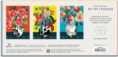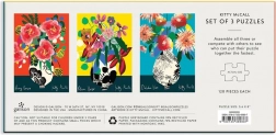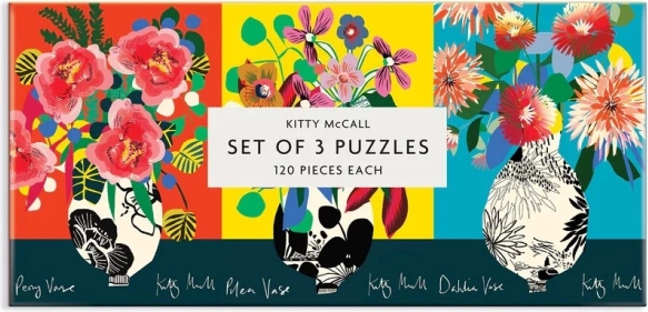 De Kitty McCall puzzelset bevat drie puzzels van 120 stukjes met opvallende kleurrijke illustraties van bloemarrangementen in vazen door de in Nigeria geboren, Britse kunstenares Kitty McCall. Beïnvloed door de natuurlijke wereld om haar heen en de levendige landschappen uit haar vroege jeugd in Nigeria, ontwikkelde Kitty McCall een kenmerkende stijl van felle kleuren, overlappende patronen en vormen om geometrische patronen en florale landschappen te creëren voor interieurs en accessoires. De buitenste doos heeft een magnetische sluiting. De puzzels zijn verpakt in een stevige doos, geschikt voor hergebruik en opslag. Ideaal als cadeau. De afbeelding is van Kitty McCall. De puzzels zijn gemaakt met een aanzienlijk aandeel gerecycled papier en hebben een hoogwaardige druk met onschadelijke inkten. Ze zijn voorzien van een matte afwerking, die onder alle omstandigheden een natuurgetrouwe weergave van details en kleuren garandeert. De achterzijde is voorzien van een glad, prettig aanvoelend oppervlak, waardoor er bij het opbergen van een gelegde puzzel geen stof ontstaat. Samen met de zorgvuldig verpakte stukjes vind je in de verpakking ook een blad met een voorbeeldafbeelding, dat doorgaans extra informatie bevat over de makers en de achtergrond van het werk. Geleverd in een uitzonderlijk stevige en aantrekkelijk uitgevoerde kartonnen doos van gerecycled karton. Belangrijkste kenmerken: 120 nauwkeurig uitgesneden stukjes, gemaakt met gerecyclede en duurzaam verkregen materialen, zorgvuldig gekozen motief van gerenommeerde makers en kunstenaars, bedrukking en afwerking van de hoogste kwaliteit, bevat een voorbeeldafbeelding