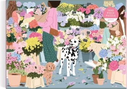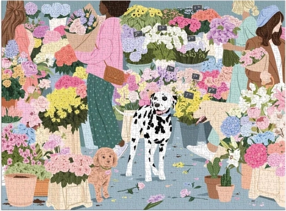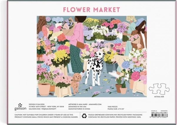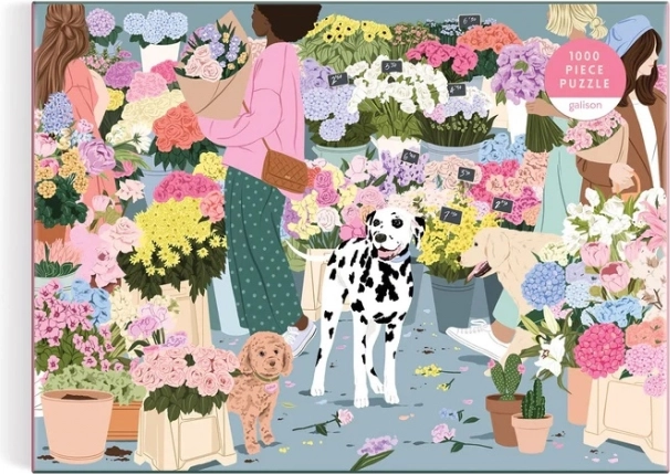 Dompel je onder in de levendige sfeer van een drukke bloemenmarkt met mensen en honden, inclusief een iconische dalmatiër in het midden van de scène. De GALISON puzzel blinkt uit door eersteklas drukwerk met veilige inkten en een matte afwerking die kleuren en fijne details natuurgetrouw weergeeft en reflecties minimaliseert.