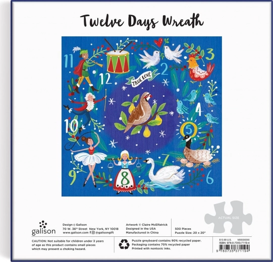 De puzzel Twaalf dagen van Kerstmis betovert met zijn indrukwekkende illustratie en eersteklas kwaliteit. Hij is verpakt in een zeer stevige en opvallende doos van gerecycled karton, die hergebruik en opslag mogelijk maakt. Het oppervlak van de stukjes is mat, wat zorgt voor een getrouwe weergave van details en kleuren, en de achterkant is voorzien van een gladde afwerking die prettig aanvoelt.