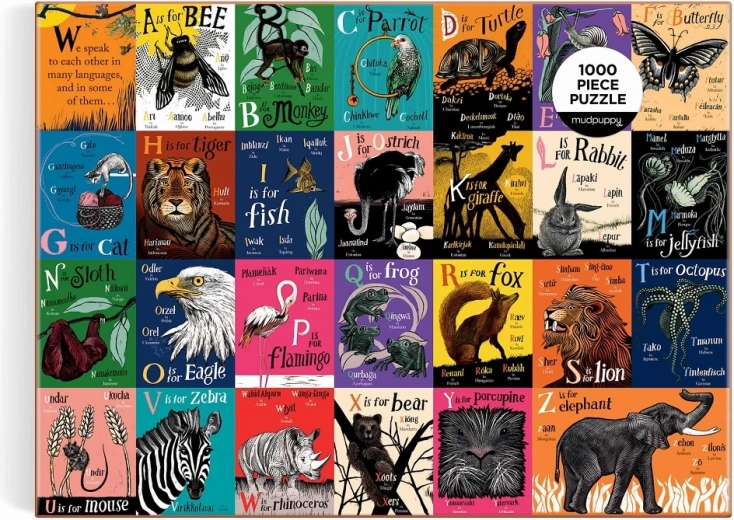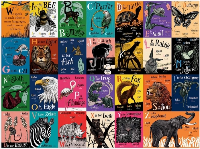 Elk stukje biedt een kans om letters van het alfabet en diernamen in meerdere talen te leren.