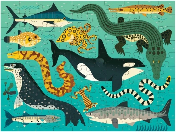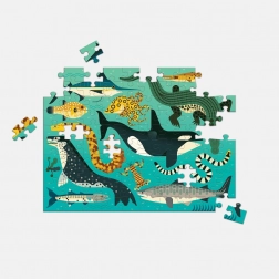 Deze boeiende puzzel toont aan de ene kant landroofdieren en aan de andere kant zeejagers van de diepte. Gemaakt van een aanzienlijk aandeel gerecycled papier, garandeert duurzaamheid en de veiligheid van de gebruikte inkten. Het matte oppervlak zorgt voor een trouwe weergave van details en kleuren, en het gladde achteroppervlak voorkomt stofvorming tijdens de opslag.