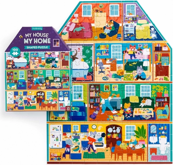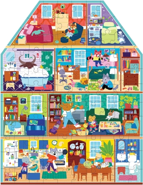 Het huisvormige ontwerp maakt de puzzel aantrekkelijk voor kinderen, met kleurrijke illustraties van afzonderlijke kamers.