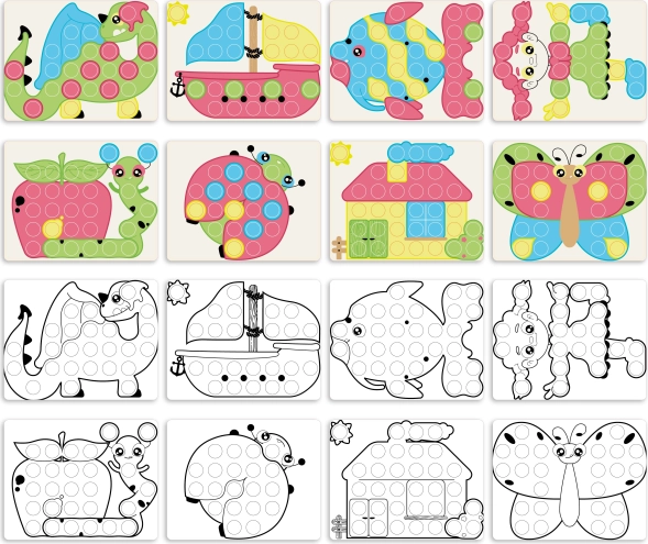Fantacolor Junior Play Eco+ is een slimme educatieve mozaïek die kinderen aanzet tot creativiteit en geduld. Dankzij het transparante geperforeerde bord plaatsen kinderen gemakkelijk de grote, ronde pinnen in de gaten en leggen ze aan de hand van de geïllustreerde kaarten schattige dieren- en voorwerpmotieven.