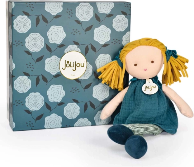 De pop Jade van Doudou Jolijou is een tedere metgezel voor baby’s en peuters/kleuters. Haar boho-look wordt benadrukt door gestreepte kousen, een turkooizen jurkje en “spaghetti-achtige” blonde haartjes in staartjes. Dankzij de zachte textiele uitvoering is ze heerlijk knuffelbaar en maximaal veilig.