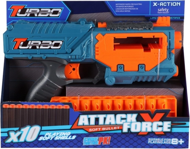 Blaster Turbo mini is een compact en krachtig speelblaster met een bereik van 8-15 meter, die hoge precisie en veilig schieten biedt dankzij kogels van zacht schuimmateriaal.