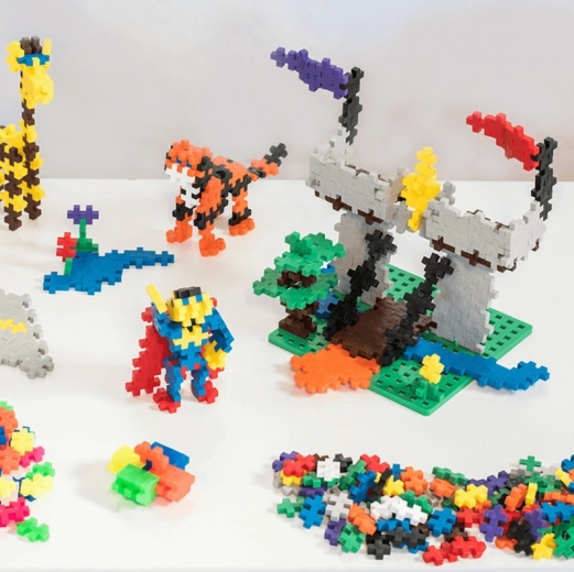 Bouw platte afbeeldingen en ruimtelijke modellen – bijvoorbeeld een giraf en boom op de bouwplaat. Ondertussen ontwikkelen kinderen hun ruimtelijke oriëntatie en fijne motoriek.