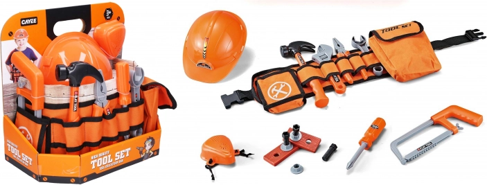 Praktische kinderset voor kleine reparateurs met alles wat nodig is voor veilig spelen en de eerste “doe-het-zelf” pogingen. Inclusief een textiele riem voor het comfortabel dragen van gereedschap, een helm en een rijke uitrusting: mondkapje, zaagje, hamertje, combinatietang, pijptang, schroevendraaier, sleutel, 2 latjes, 3 schroeven en 3 moeren.