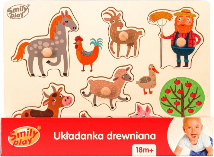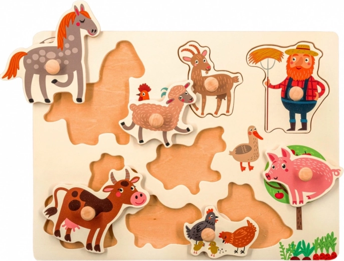 Ontdek de speelse en leerzame houten inlegpuzzel met boerderijdieren, die de fijne motoriek, oog-handcoördinatie en concentratie stimuleert. De stukken met praktische knopjes zijn makkelijk op te pakken en passen in de nauwkeurig gefreesde uitsparingen, waardoor de puzzel ideaal is voor jonge kinderen.