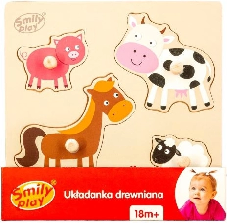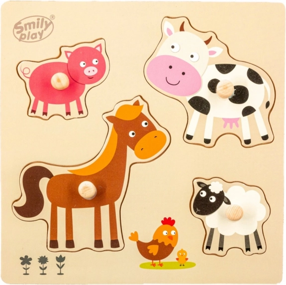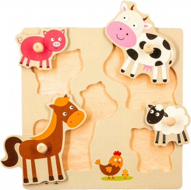 Houten puzzel met speciaal gevormde uitsparingen op het bord, met vier verschillende vormen en kleuren die boerderijdieren voorstellen. Elk puzzelstuk heeft een knopje waardoor het voor het kind gemakkelijker is om te leggen.