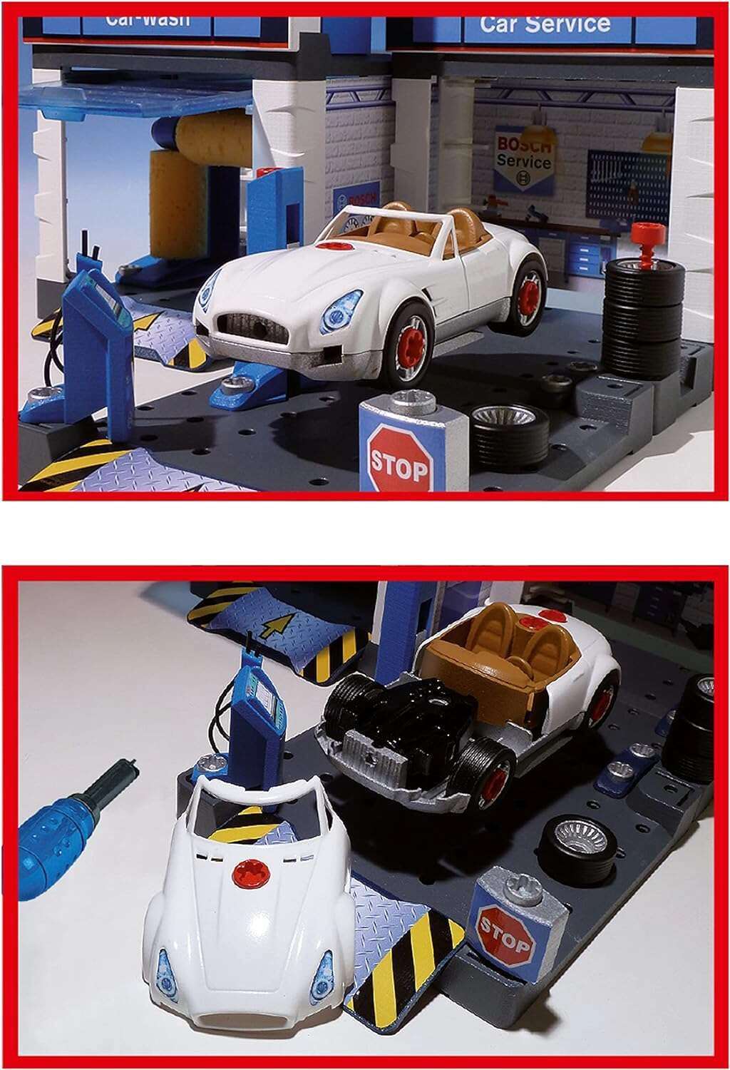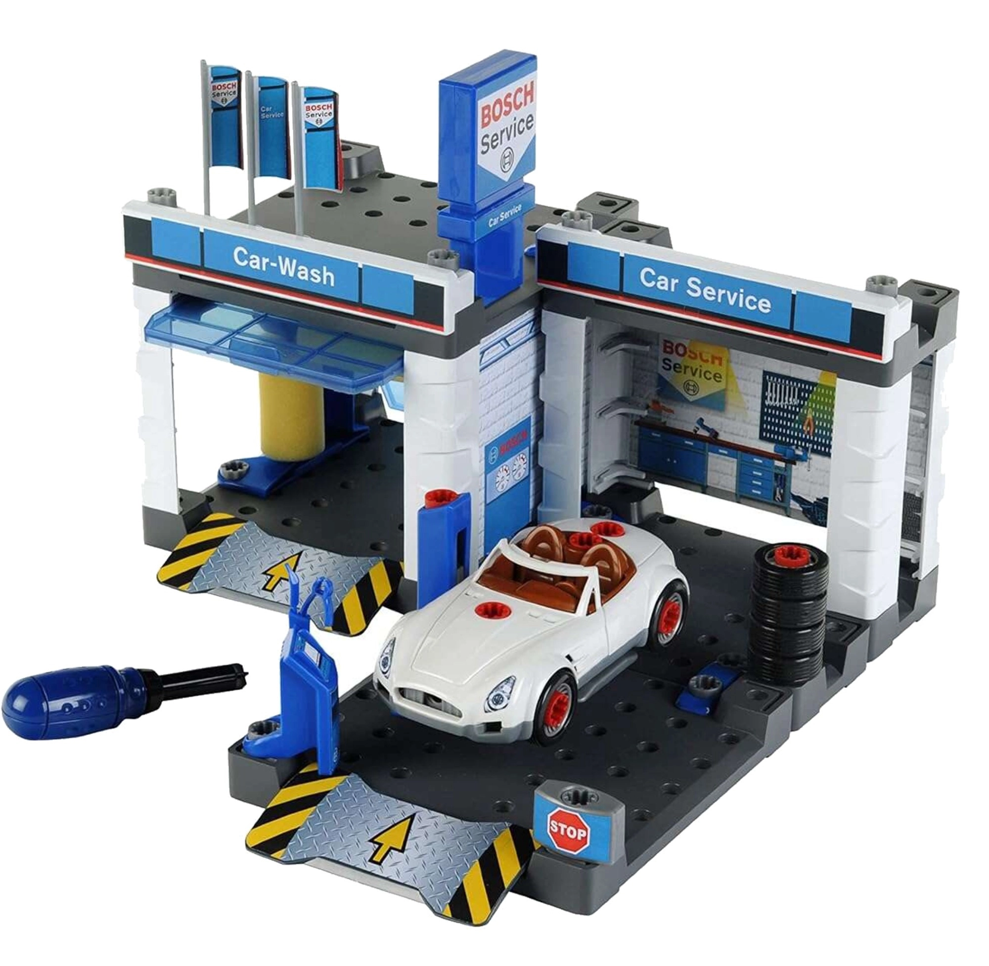 Dit servicestation in het thema BOSCH Service combineert een wasstraat, servicezone en montagewerkplaats in één. Inbegrepen is een witte cabrio die kinderen kunnen demonteren en opnieuw monteren met de meegeleverde schroevendraaier. De bewegende borstels van de wasstraat, het hefplatform en de servicebalie met “computer” zorgen voor een realistische speelervaring.