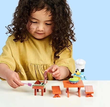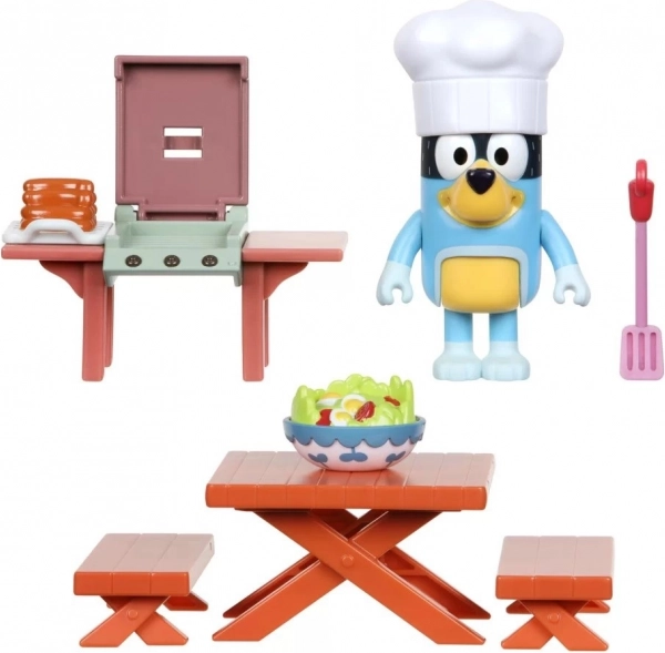 Complete mini-set met Bluey-figuur met koks­muts, barbecue en picknicktafel. Ideaal om favoriete momenten uit BLUEY na te spelen.