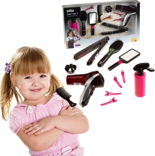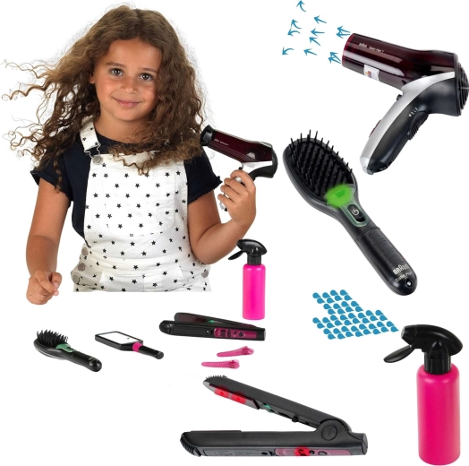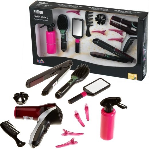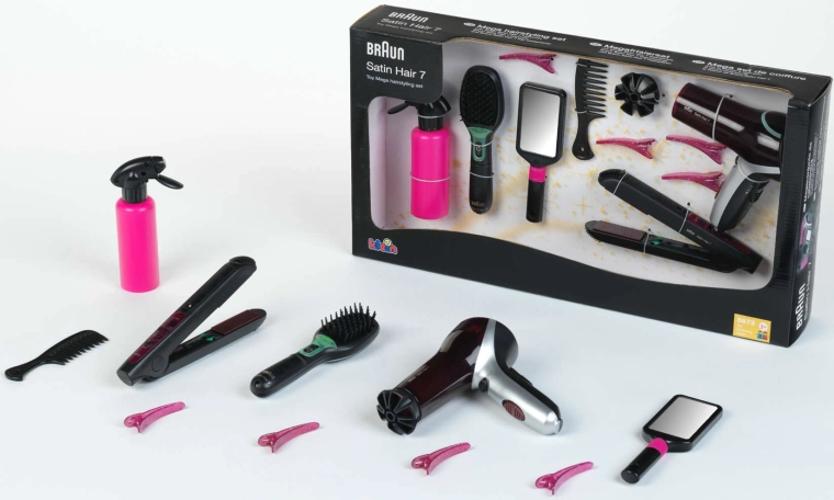 Grote kappersset geïnspireerd op de BRAUN Satin Hair-lijn, met alles wat kinderen nodig hebben voor stijlvolle kapsels. De speelgoedtools zijn ontworpen met oog voor veiligheid en imiteren echte hulpmiddelen – de föhn, stijltang en borstel werken op batterijen en zorgen voor realistische licht- en geluidseffecten, terwijl ze geen warmte of luchtstroom produceren.