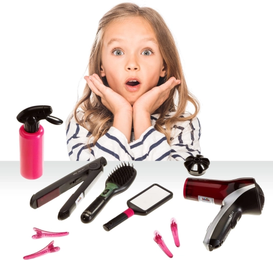 Het spiegeltje, de kam, de plantenspuit, het opzetstuk voor de föhn en vier glinsterende speldjes laten kinderen kapsels maken en urenlang kappertje spelen.