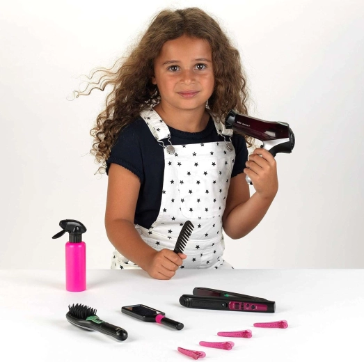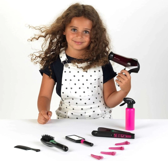 De set bevat ook handig accessoiremateriaal: een spiegeltje, kam, plantenspuit voor water (navulbaar), een verwisselbaar opzetstuk voor de föhn en 4 roze glinsterende speldjes om het haar gemakkelijk te verdelen en te versieren. Kinderen kunnen zo een echte salon naspelen en hun fantasie, fijne motoriek en sociale vaardigheden ontwikkelen.