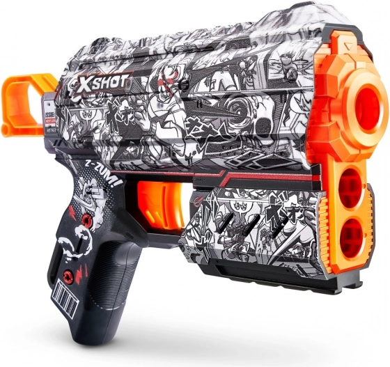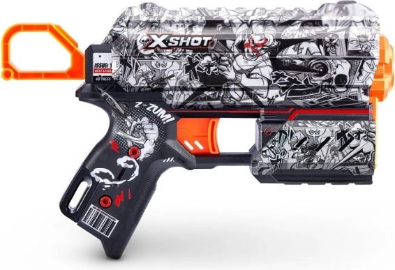 Beleef actievol plezier met de X-Shot Skins Flux-blaster, die opvalt door het comic-/graffitidesign en de comfortabele ergonomie. Dankzij de hoogwaardige afwerking en het eenvoudige herladen is hij ideaal voor snelle gevechten binnen en buiten. Darts met luchtkamers vliegen verder en stabieler – precies waar je op mikt.