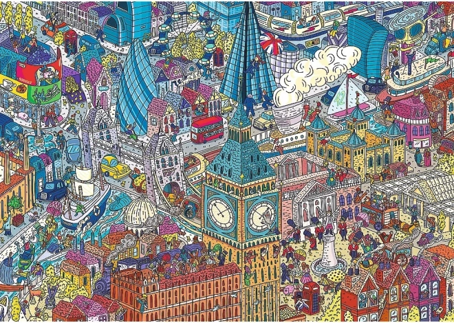 Trefl UFT puzzel Eye-Spy Time Travel: Londen 1000 stukjes. Onbeperkt koppelen van motieven, hoogwaardig blauw karton, unieke vormen, eco-verpakking. Afmeting 68,3×48 cm.