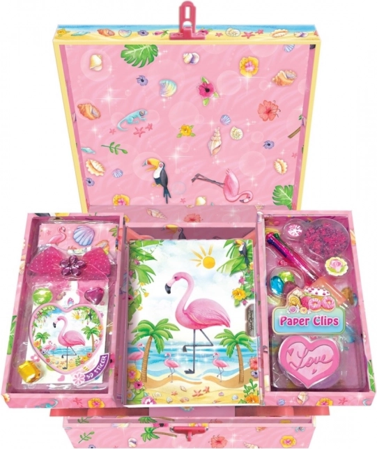 De Set met vakjes Flaming van Pecoware bevat alles wat je nodig hebt voor creatief plezier. Ontdek een kleurrijk schrift met slot, een pen met vier kleuren, en diverse versieringen in een elegante doos.