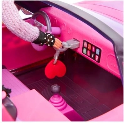 Een draaibaar stuur, draaiende wielen, een gedetailleerd dashboard en een contactsleutel met hartvormige hanger zorgen voor een authentiek rijgevoel.