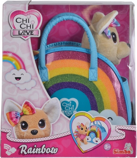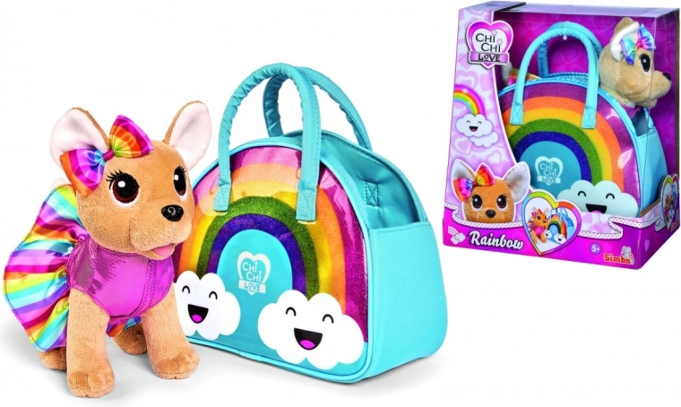 Pluchen chihuahua-hondje gekleed in een schattige regenboogoutfit met bijpassende strik, met een kleurrijke en glinsterende regenboogprint die zeker zal verheugen.