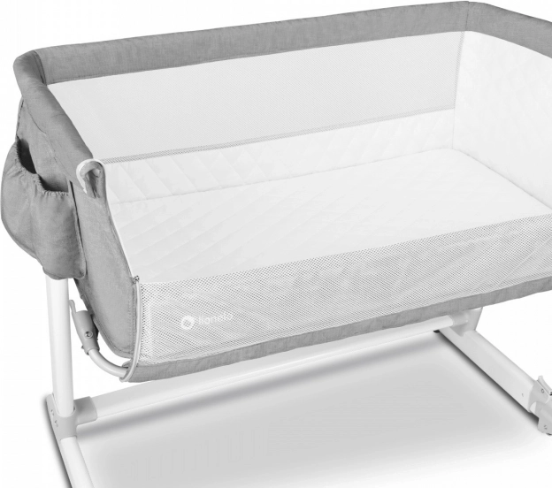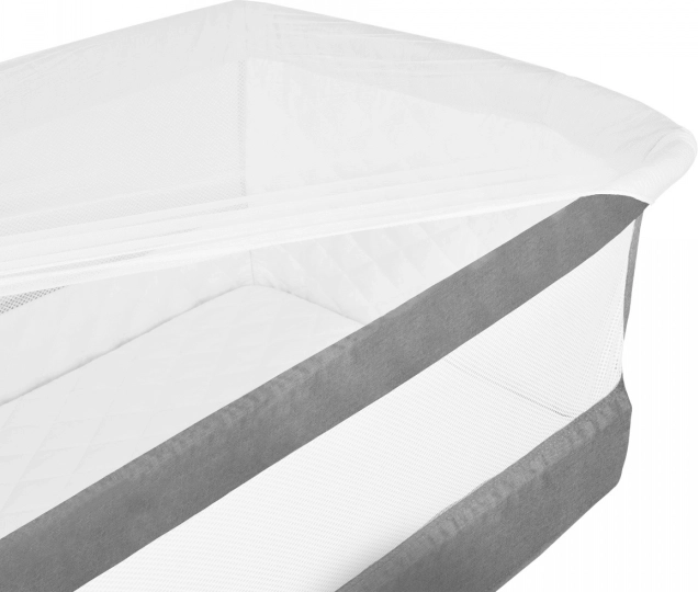 Het bedje biedt 5 hoogtestanden voor perfecte uitlijning met het ouderlijk bed en een kantelfunctie van de matras die verlichting geeft bij verkoudheid of spugen. Het grote mesh-paneel zorgt voor constante luchttoevoer en beter zicht op de baby. Constructie en matras voldoen aan de strenge veiligheidsnormen EN 1130 en EN 16890, bevestigd door Intertek-tests.