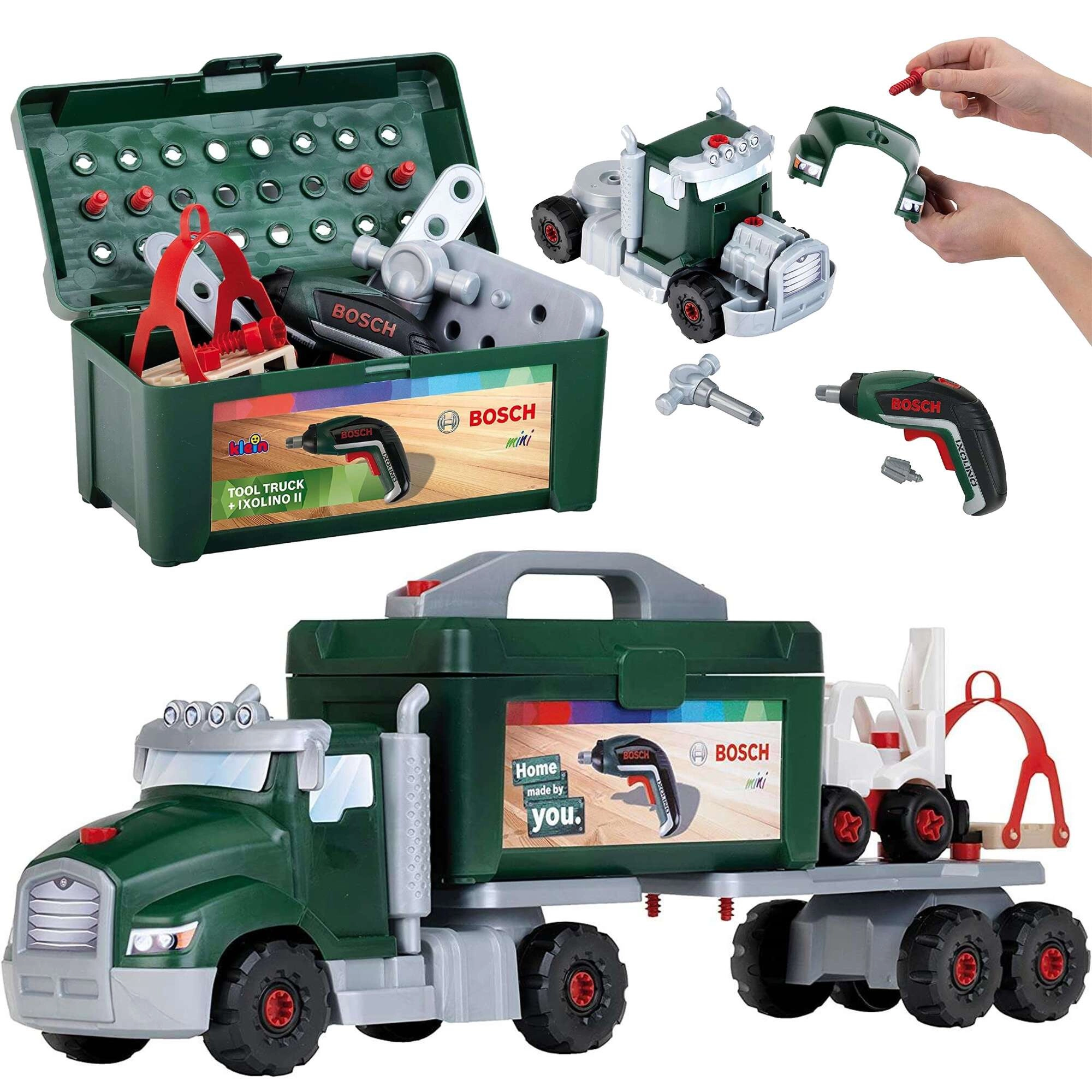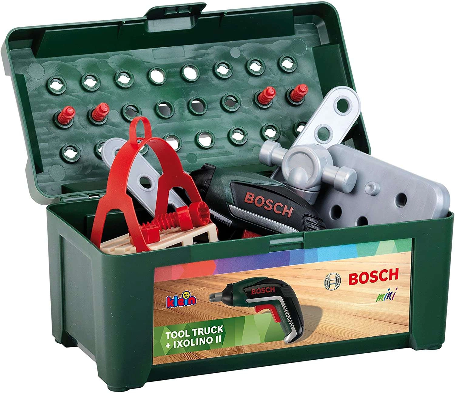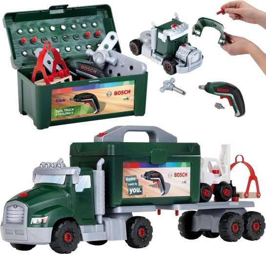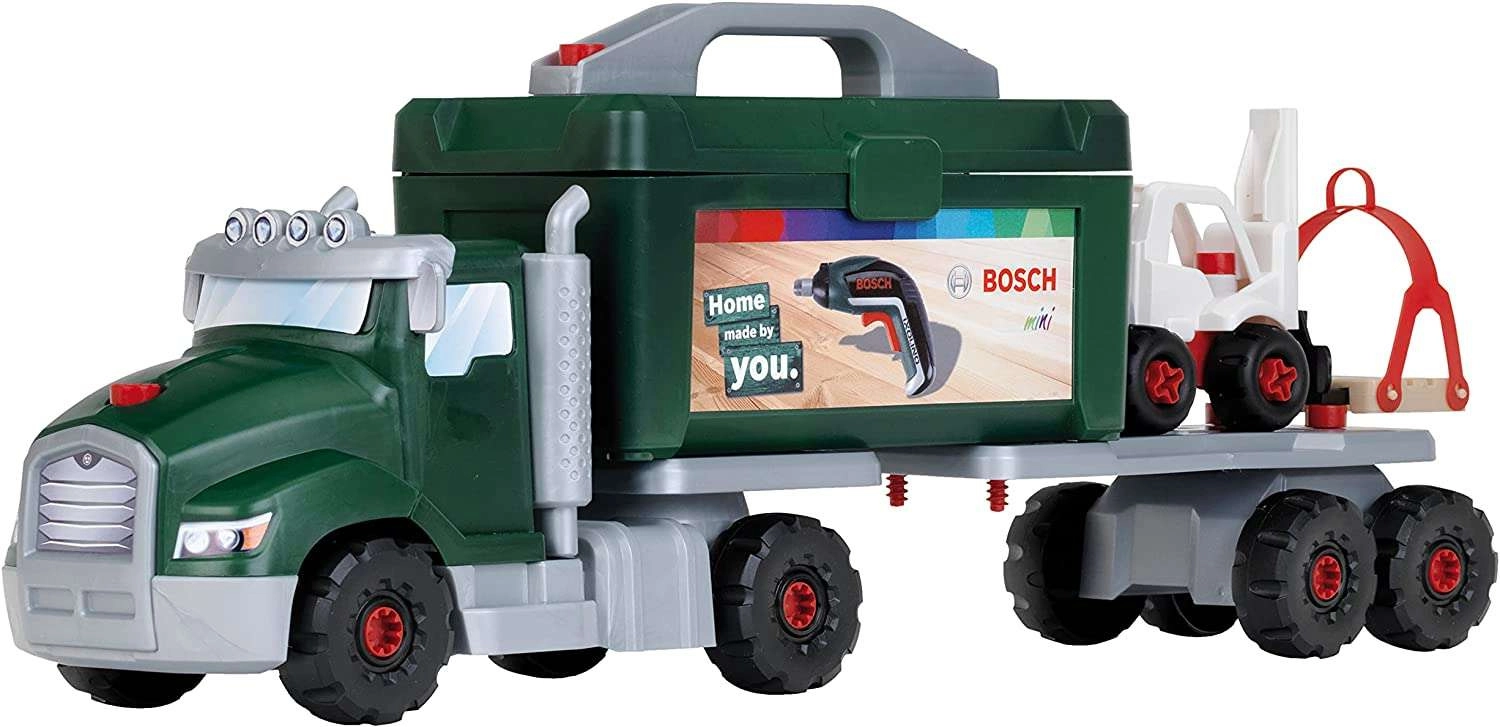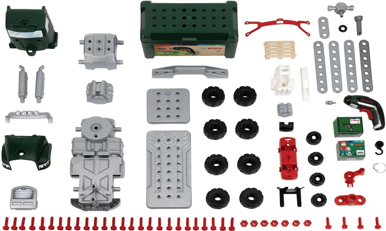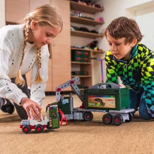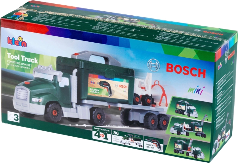 De kinderconstructieset schroefbare BOSCH-vrachtwagen van het merk Klein biedt eindeloze speelmogelijkheden. In de verpakking vind je 86 delen, waaronder een afneembare gereedschapskist, aanhanger, kraan, boormachine en een kleine heftruck. Kinderen trainen hun vaardigheid, logica en verbeelding, en dankzij de robuuste afwerking gaat de set jarenlang mee voor volop speelplezier.