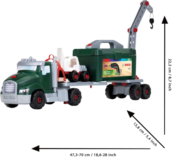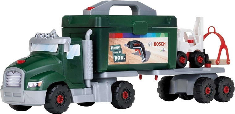 De set omvat een vrachtwagen met aanhanger, een kraan, een heftruck met pallet en een set schroeven en onderdelen voor variabel bouwen. Hoogwaardige kunststof, gedetailleerde afwerking en soepel rollende wielen ondersteunen creatief spel en rollenspel thuis en onderweg.