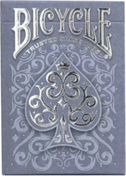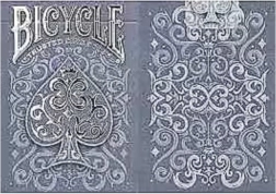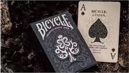 Elegante speelkaarten Bicycle Cinder, geïnspireerd door mysterieuze kampvuurrrook, vallen op door een verfijnd grijs design met glanzende zilverfolie en 3D-reliëf. Warme goudtinten van de hofkaarten doen denken aan gloeiende kooltjes en de verpakking wordt gecompleteerd door een originele sluitzegel.