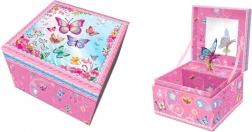 Klassieke muziekdoos met vlindermotief. Open hem en het figuurtje begint te draaien met een klassieke melodie. Als de melodie eindigt, hoeft hij alleen opnieuw opgewonden te worden. De doos bevat ook een spiegeltje en ruimte voor het opbergen van kleinigheden.