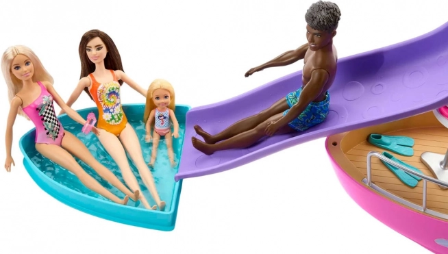 Deze stijlvolle boot van ongeveer 91 cm breed en 30 cm hoog biedt veel plek voor poppen en hun vriendjes. Kinderen kunnen de boot besturen op het bovendek, zonnen en via de paarse glijbaan zo het blauwe zwembadje in glijden. Het afneembare bovendek geeft toegang tot het gedetailleerde interieur voor eenvoudig speelplezier.