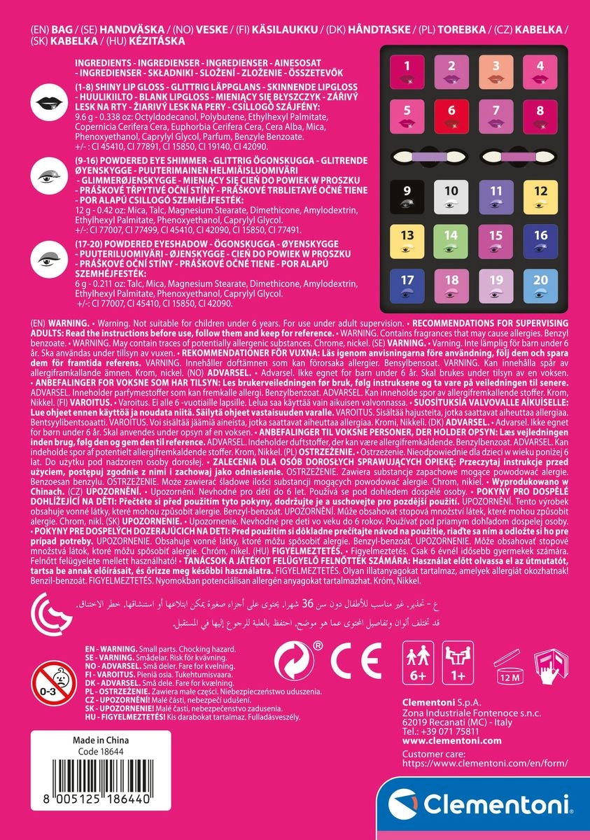 Stijlvolle kinder-make-uppalet in de vorm van een handtasje voor kleine liefhebbers van make-up. Bevat oogschaduw, lipgloss en 2 kwastjes voor het eenvoudig creëren van dagelijkse en feestelijke looks. Stimuleert creativiteit en fijne motoriek.