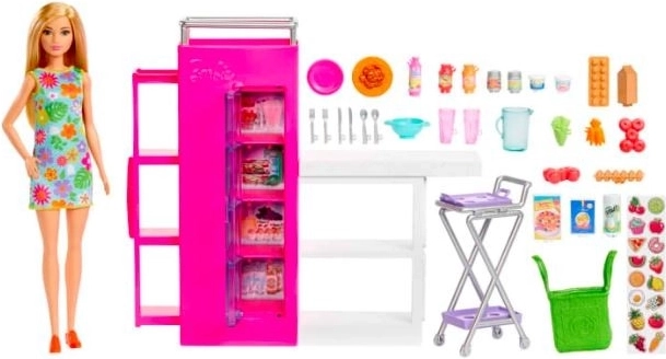Ontdek de magie van koken met de Barbie keuken, de ideale aanvulling voor elk poppenhuis of als losstaand speelgoed. Kinderen kunnen Barbie meenemen in de wereld van koken, waar ze de koelkast kunnen openen, planken kunnen uitschuiven en het keukeneiland en karretje kunnen gebruiken bij het bereiden van maaltijden.