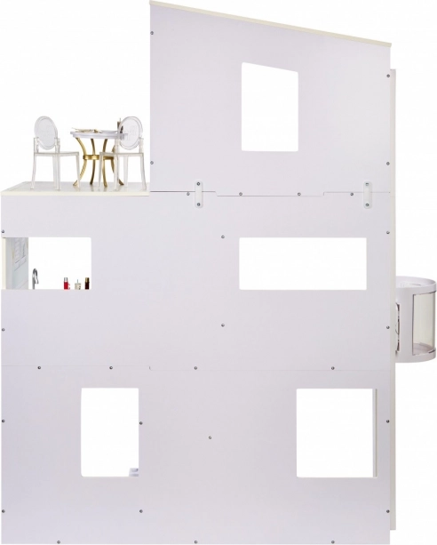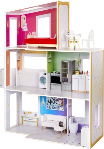 Het Rainbow High Townhouse brengt stijl en plezier naar de kinderkamer. Drie verdiepingen met een slaapkamer, woonkamer, keuken en badkamer creëren een realistische omgeving voor alledaagse verhalen. De compacte afmetingen van 89,87 × 26,04 × 50,5 cm passen perfect in de meeste kinderkamers, terwijl de robuuste constructie zorgt voor een lange levensduur van het speelgoed.