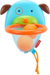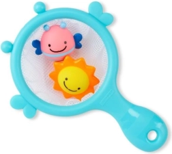 Een net met stevige handgreep, twee bekertjes en een basket voor balletjes maken van het bad een actieve speelplek die de oog-handcoördinatie bevordert.