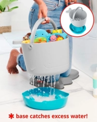 De praktische afdruipbasis en grote afvoergaten houden speelgoed droog en hygiënisch. Makkelijk te dragen dankzij de robuuste handgreep.