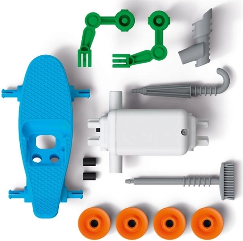 - motor met tandwieloverbrenging en batterijomodule, robotonderdelen, gekleurde stickers, handleiding