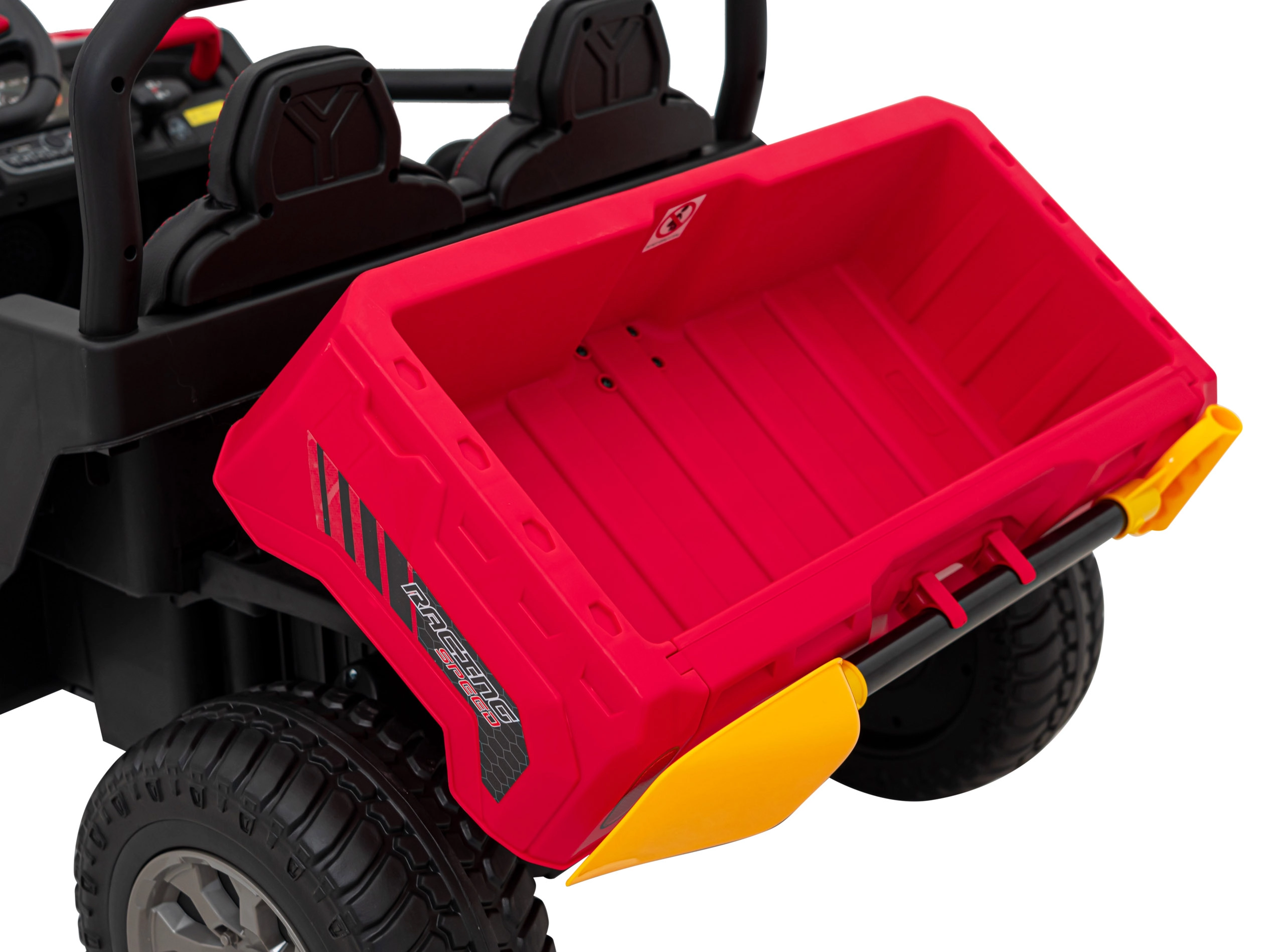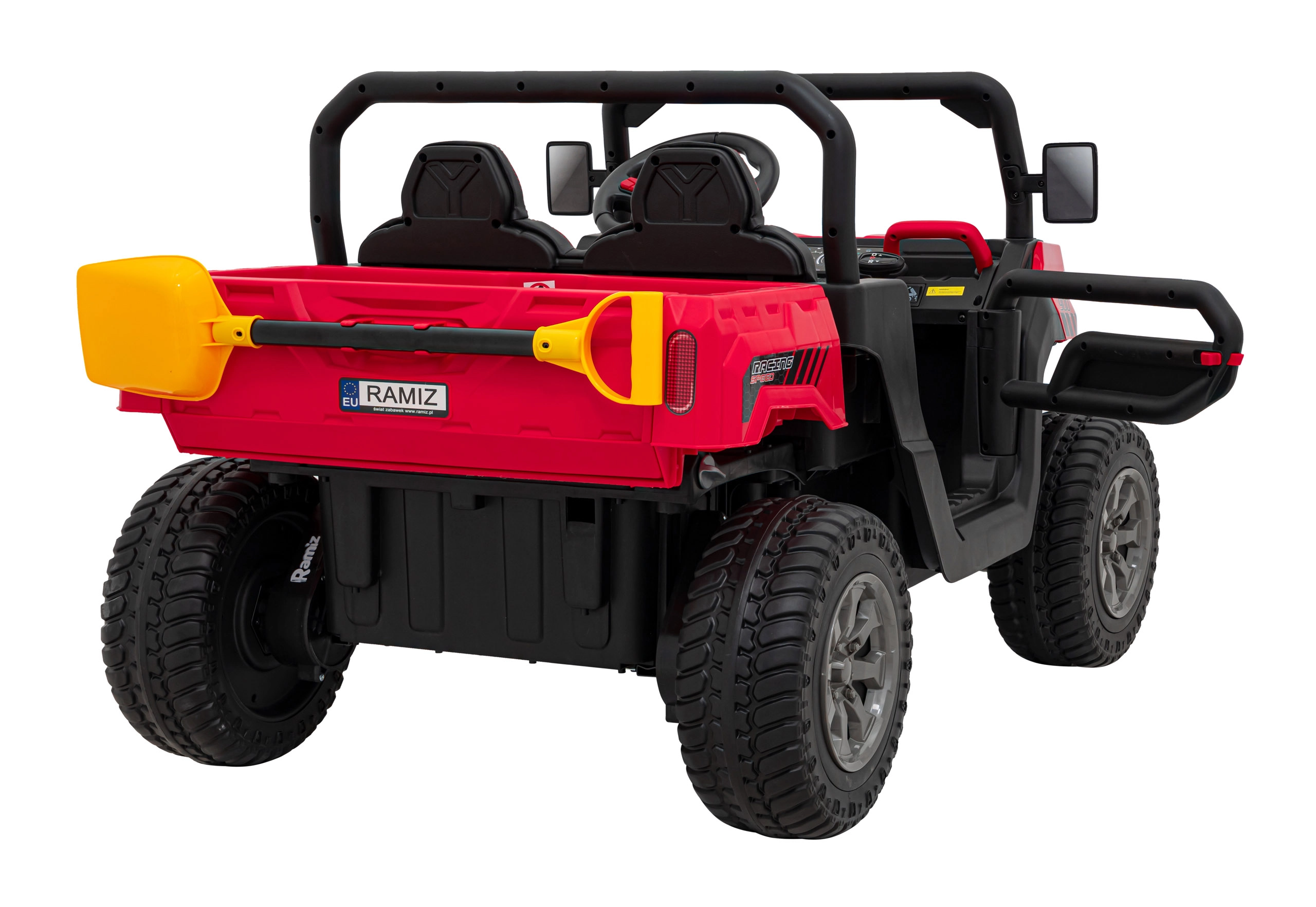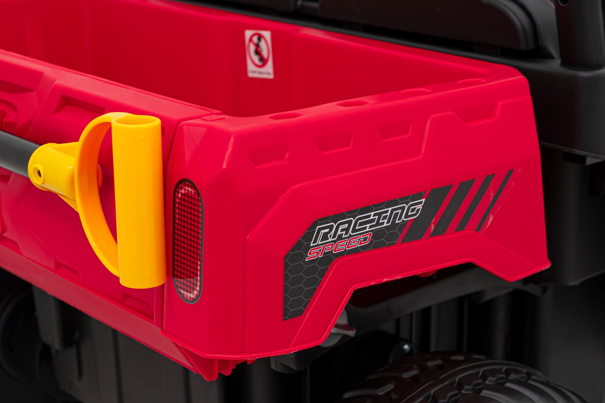 Ouders waarderen de veiligheid en controle dankzij de 2,4 GHz afstandsbediening met noodknop Stop en keuze uit 3 snelheden. Kinderen genieten van het comfort van de gevoerde eco-lederen zitting en de fun van het audiopaneel (MP3/SD/AUX) en geluiden in het stuur. De praktische achterste kofferbak 50 × 21 × 12 cm met elektrisch kantelende kiepbak en te openen klep prikkelt de fantasie tijdens het spelen.