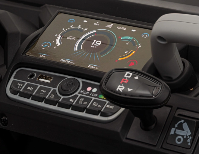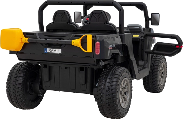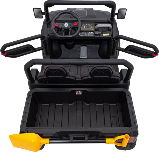 De praktische achterste laadruimte met elektrisch bediende kiepbak en te openen achterklep nodigt uit om speelgoed en zand te vervoeren – inclusief een gele schep. De tweezits stoel van eco-leer met veiligheidsgordels biedt comfort, terwijl het dashboard met MP3/SD/AUX, geluiden in het stuur en een laadindicator zorgt voor vermaak en inzicht in de accustatus.